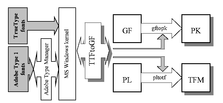 TTFtoGF - программа, работающая в среде Microsoft Windows и позволяющая выделить начертания и метрики любых TrueType и Type 1 шрифтов, используемых в MS Windows. В результате создаются 8-битные шрифты форматов, используемых в TeX